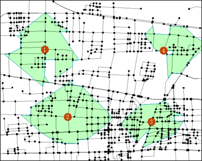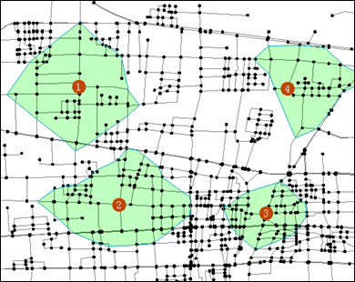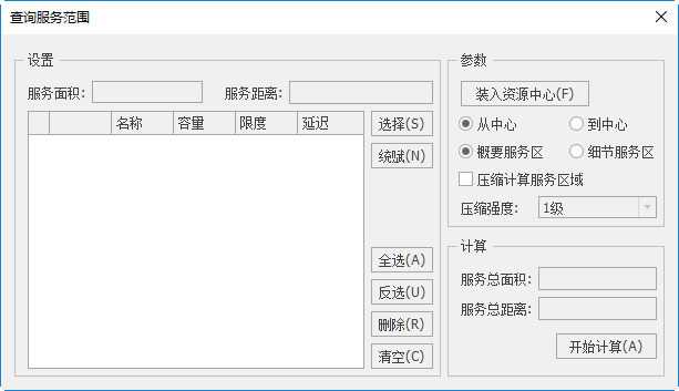 【压宿计算服务区域】:用户可选择是否进行服务区域的压缩。如果不压缩,则系统形成的是服务网络的一个外包络多边形,如果用户选择压缩,则系统形成的是服务网络的最小包络。
