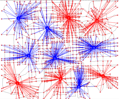 5. 点击"开始计算",开始进行定位分配分析。分析完成后,在图上突出显示分析结果,即定位分配的辐射线图。