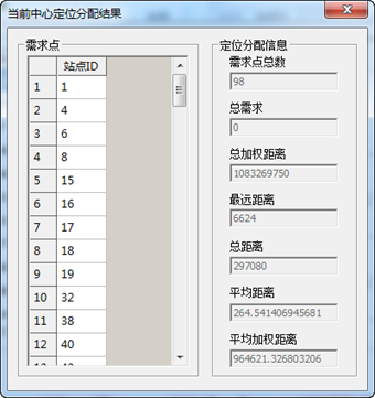 6. 点击对话框中"查看结果"按钮可查看定位分配结果,可浏览被选中心、获得分配的需求点、定位分配总体统计一览表等。