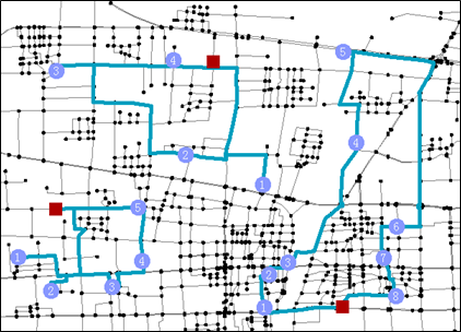 4. 点击"开始计算"按钮,进行多车送货分析,在几何图形网络上突现分析结果。