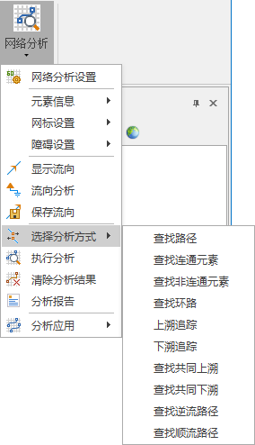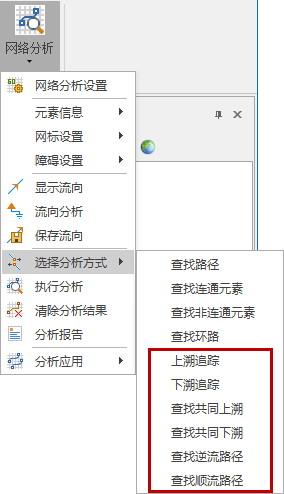 网络分析方式有查找路径、查找连通元素、查找非连通元素、查找环路、上溯追踪、下溯追踪、查找共同上溯、查找共同下溯、查找逆流路径和查找顺流路径十种分析方式,具体每种分析的操作详见本章的"基础网络分析"小节。