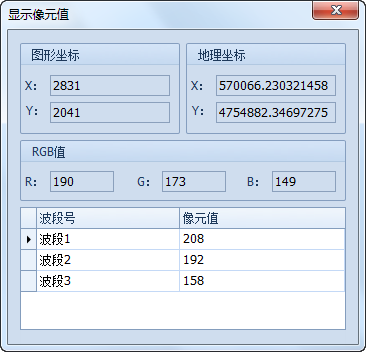 3. 查看像元值。在“显示像元值”窗口上,可以查看视图窗口十字光标焦点处的图形、地理坐标值,查看该点对应波段处的像元值、显示颜色对应RGB值等信息。用户可以在地图视图上,双击要查看的点位置,十字光标的中心会随之定位到该点;另外,还可以在十字光标的中心,点击鼠标左键,拖动十字光标到要查看的点处,以取得相应点的像元值信息。