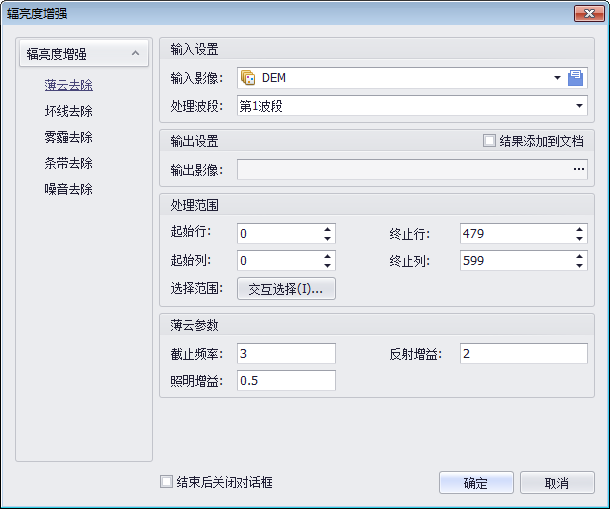 1. 单击菜单栏的“栅格编辑”,在其下拉菜单中,选择“辐亮度增强”,弹出“辐亮度增强”对话框。选择对话框的“薄云去除”页面,页面视图如下: