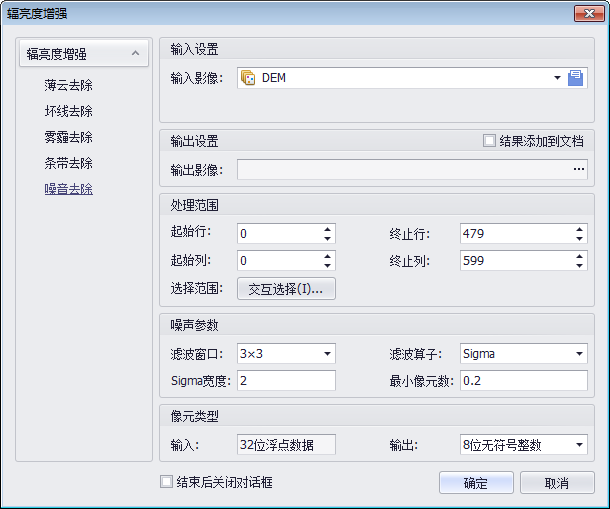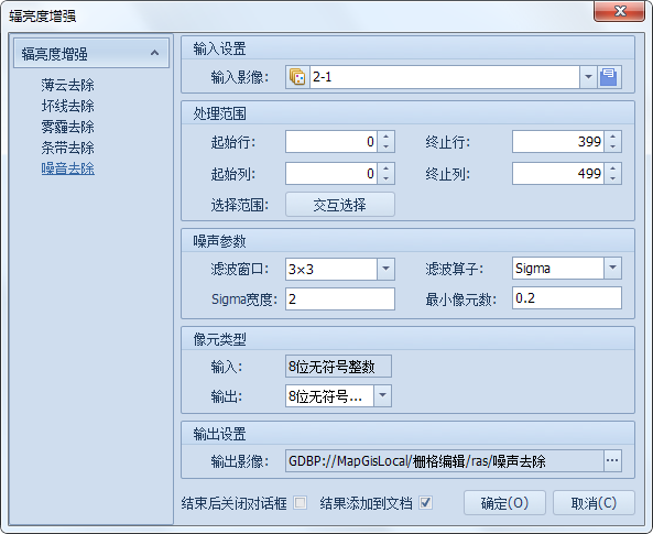 若在噪音去除的参数设置时,勾选“结束后关闭对话框”,完成操作后,“图像拉伸”对话框会自动关闭;若勾选“结果添加到文档”,处理结果会自动添加到当前地图文档中。