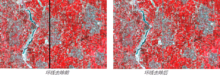 传感器在获取图像的过程中,若其中的某个探测器工作不正常,就有可能产生一整行没有光谱信息的线。若探测器的线阵列工作不正常,就会使整列数据都没有光谱信息。行或列数据信息的缺失称为影像中的坏线。坏线去除就是将原始扫描图像中的缺失扫描线(行或列),用相邻像元灰度值按照一定的计算方法予以替代,达到去除坏线的目的。具体操作为: