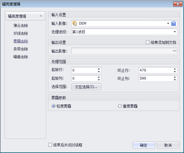 4. 设置雾霾参数。根据影像上雾霾的严重程度,系统提供了两种参数:轻度雾霾和重度雾霾。