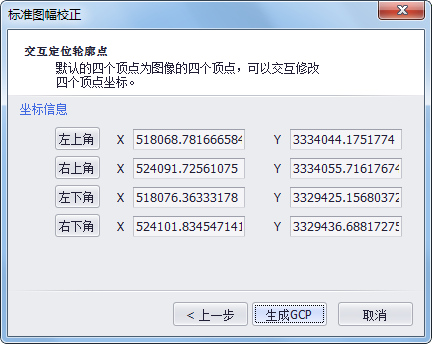 完成以上步骤后,点击“生成GCP”,对话框关闭,待校正的栅格图像上出现通过之前鼠标确定的四个图廓点计算得到的所有实际控制点。(对话框上显示的四个坐标,是根据输入的图幅信息生成的理论坐标值,此坐标为平面直角坐标)