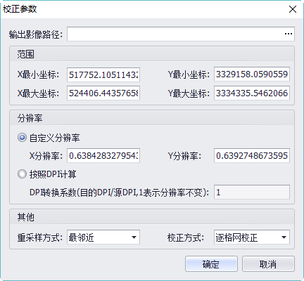 - 【自定义分辨率】:设置输出结果的分辨率,系统对根据原始图像的行列值计算出一个合适的值,一般不建议用户修改;