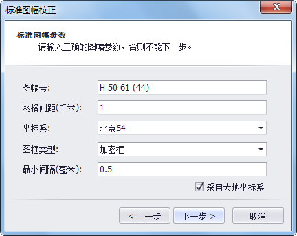 2. 在弹出的对话框中点击按钮,添加待校正的标准栅格数据,点击"下一步"后,在新的对话框中输入图幅号等相应的参数:
