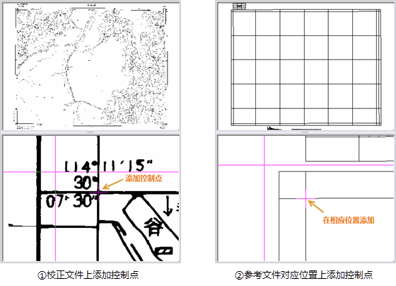 2. 添加控制点。点击添加控制点分别在待校正图层和参考图层上选择对应的控制点,空白键确认。