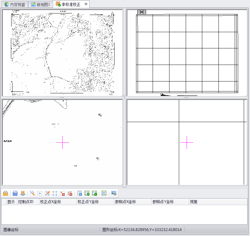 图层添加完毕后,点击"确定",系统界面变成如下图所示,其中左上为校正影像显示窗口,左下为校正文件局部放大显示窗口,右上为参考文件显示窗口,右下为参考文件局部放大显示窗口,最下方为控制点列表显示窗口。