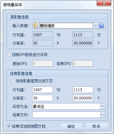 1. 使用DPI参数进行采样的方法,是针对用户已知原始DPI和结果DPI的情况下进行的重采样方法,操作过程中用户需手动输入原始DPI和结果DPI,系统会根据这两个值自动进行重采样。一般的栅格数据不建议选用该方法。