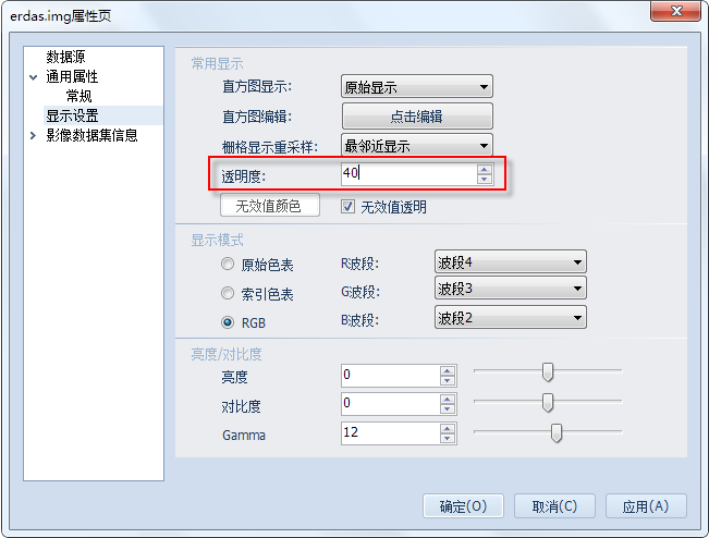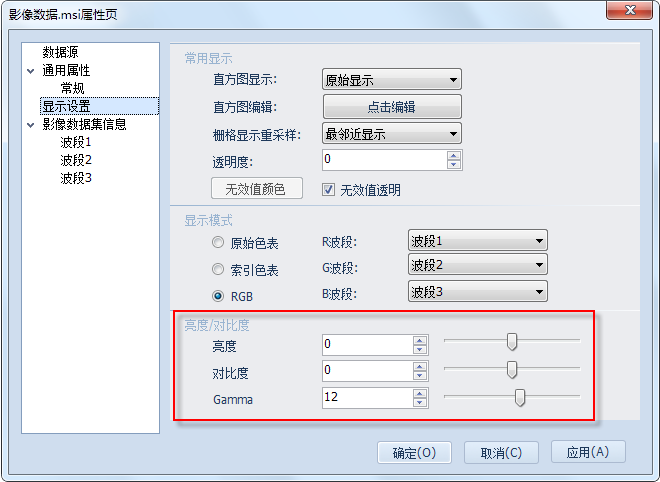2. 在栅格数据属性页对话框中,选择“显示设置”,在设置页面上,调节“亮度/对比度”一项(下图框选处),可以调节影像的亮度、对比度、Gamma值,使得数据有更好的显示效果。