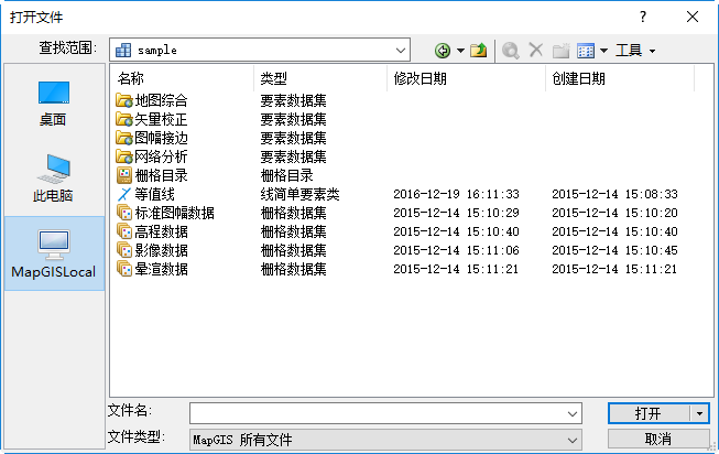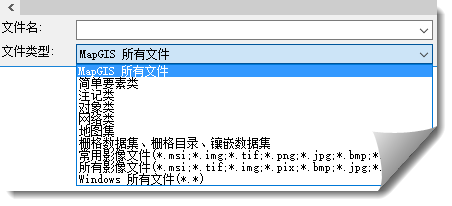 2. 在打开文件对话框“的文件类型”下拉菜单中,选择要添加的栅格数据的类型:若要添加MapGIS GDBCatalog中的栅格数据,请选择文件类型为“栅格数据集、栅格目录”;若要添加本地影像文件,选择文件类型为“常用影像文件”;