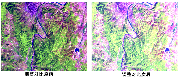 对比度调节主要是改变影像的亮度显示效果。您可以通过对比度调节功能,调整栅格的显示亮度值、色彩对比度值以及Gamma值。实现栅格数据的对比度调节有两种途径:数据图层的右键“属性”对话框;另外是通过栅格编辑工具条上的功能按钮来实现。