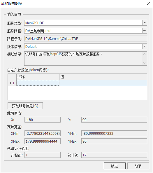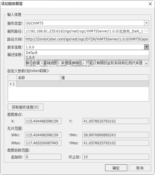 3. 点击“获取服务信息”按钮,对话框下方将显示瓦片数据的相关信息;