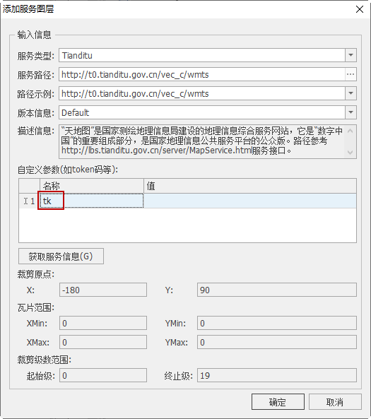 3、天地图地图服务对所有用户开放。但在使用其服务资源之前,需要申请Key。在“添加服务图层”对话框中,设置服务类型为Tianditu,服务路径参考“路径示例”下拉列表的值进行设置,然后设置自定义参数,在名称列输入“tk”,在值列中输入您的浏览器类型token码, 完成设置,点击"确定",执行天地图服务图层的添加。