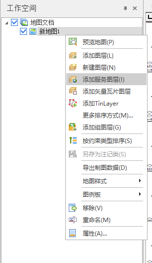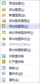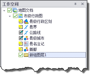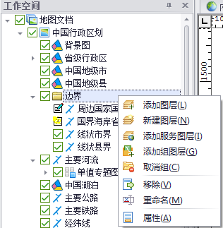 1. 在工作空间右键选择文档树下的地图节点,在弹出的右键菜单中选择“添加组图层”项,即在该地图下添加组图层。