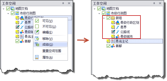 在地图中选中多个图层,点击右键,选择“成组”,则多个图层组成一个组图层,如下图所示: