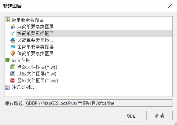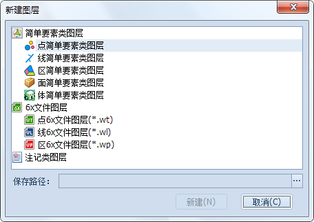 2. 在新建图层对话框中,选择您要创建的图层类型。系统提供了简单要素类图层(点、线、区、面、体),6x文件图层(点、线、区)以及注记类图层的创建。