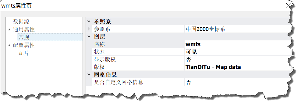 (2)“常规”选项卡:列举了服务图层的参照系、名称、版权等信息。