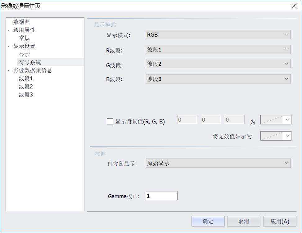 - 【显示模式】:包括原始色表、索引色表、RGB合成三种方式。其中,当原始栅格数据的波段数大于等于2时,才可设置RGB显示模式。
