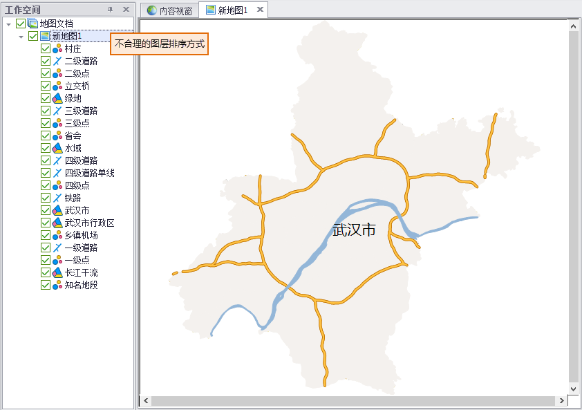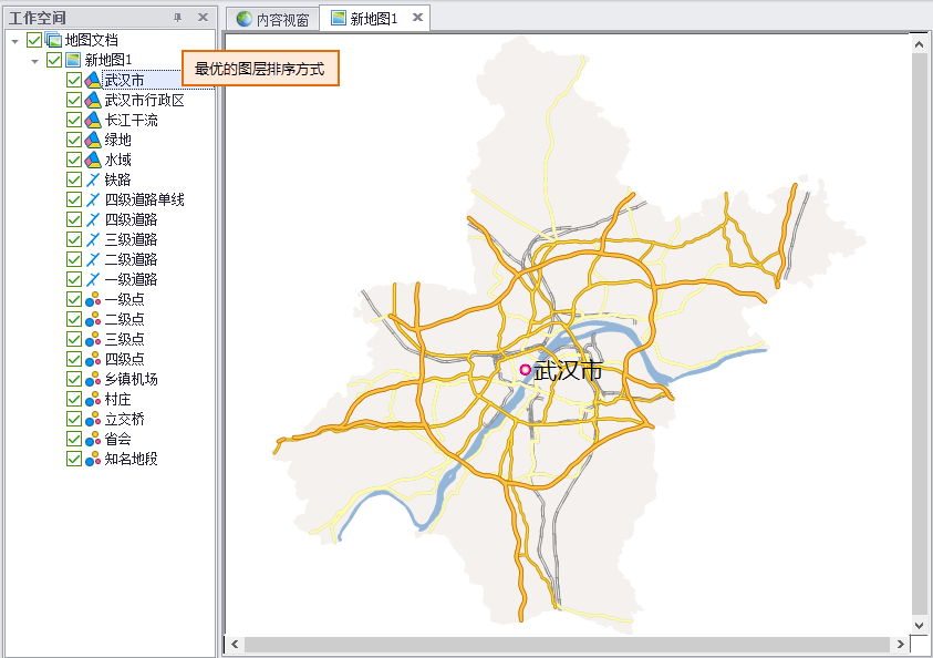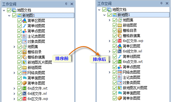 同时添加多种类型的图层时,MapGIS中默认会按照服务图层、镶嵌数据集、栅格、区、线、点的顺序进行自动排序,保证图层的默认添加顺序可满足大多数应用需求。用户也可按照实际应用需求调整图层顺序。