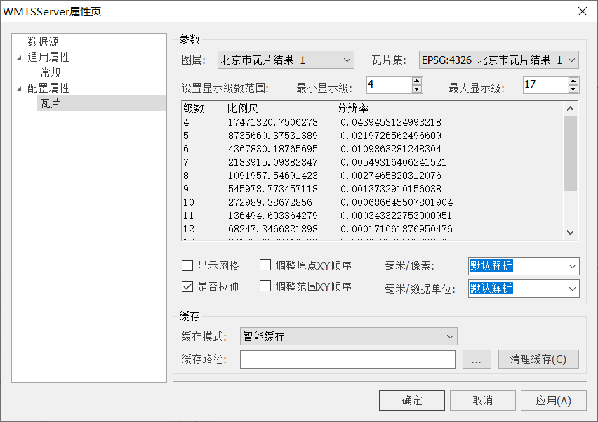 (3)“瓦片”选项卡:罗列了服务图层的瓦片信息,包括裁剪级数和各级比例尺信息。