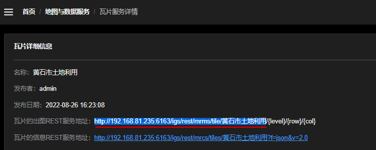 在瓦片服务详细信息页面,如下图,截取“瓦片的出图REST服务地址”的部分路径如:http://192.168.81.235:6163/igs/rest/mrms/tile/黄石市土地利用。