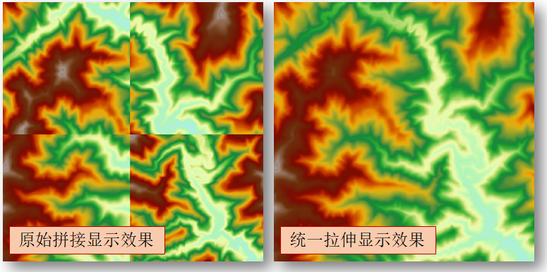 - 【统一拉伸】:采用原始色表或索引色表显示时,可设置统一拉伸显示,用于设置栅格数据显示时的色表拉伸值范围。勾选“统一拉伸”时,栅格数据按照用户设置的最大最小值进行拉伸。对于多幅DEM数据拼接显示时,由于每一幅DEM数据的最大最小值范围不同,导致两幅DEM接缝处会有明显的色彩差异,通过统一拉伸显示设置所有DEM数据拉伸显示的最大最小值范围,可有效去除接缝处的色彩差异。显示模式选择“索引色表”时,用户可通过彩色查找表自行选择色带。