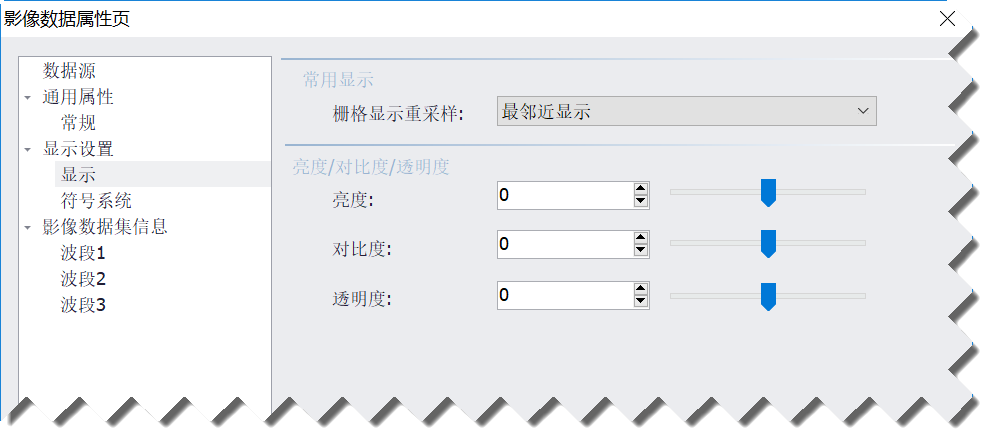 ①“显示”栏中,可设置栅格显示重采样方式及亮度、对比度、透明度值。
