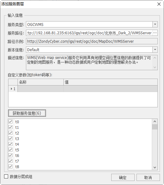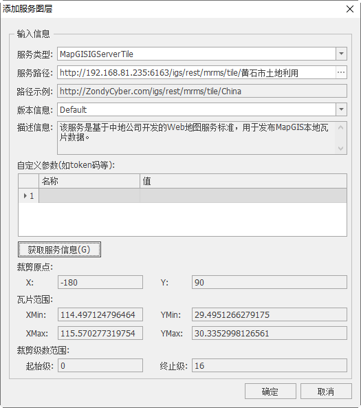 3. 点击“获取服务信息”可查看服务的信息,点击"确定"即可添加该瓦片服务图层。
