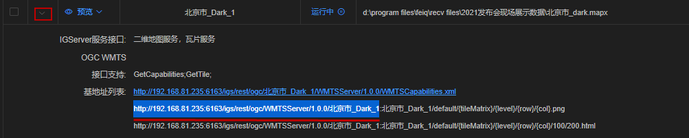 2. 在信息的“基地址列表”中,可以截取第2或第3条地址的前部分,如:http://192.168.81.235:6163/igs/rest/ogc/WMTSServer/1.0.0/北京市_Dark_1,该地址即为服务地址。