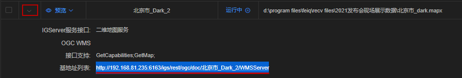 2. 选择“基地址列表”中地址如:http://192.168.81.235:6163/igs/rest/ogc/doc/北京市_Dark_2/WMSServer,该地址即为服务地址。