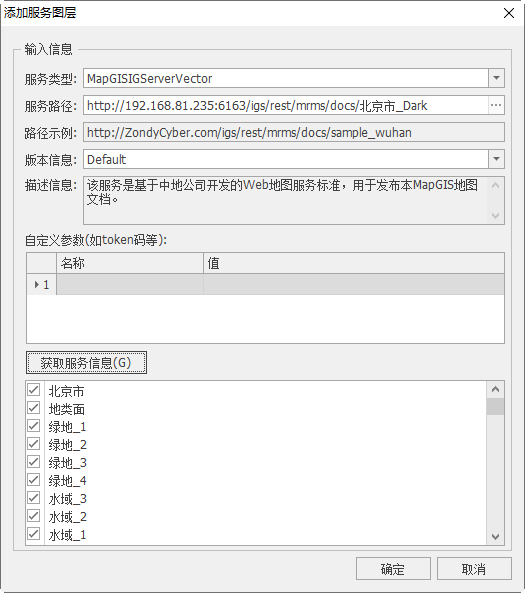 3. 点击“获取服务信息”可查看服务的信息,点击"确定"即可添加该地图文档服务图层。