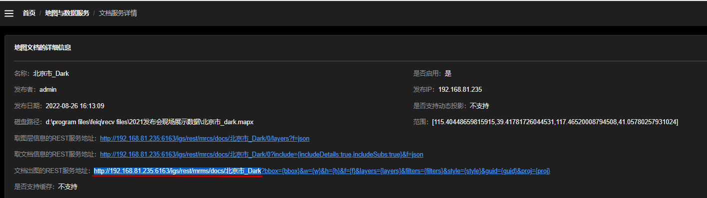 在地图文档服务详细信息页面,如下图,截取“文档出图的REST服务地址”的部分路径如:http://192.168.81.235:6163/igs/rest/mrms/docs/北京市_Dark。