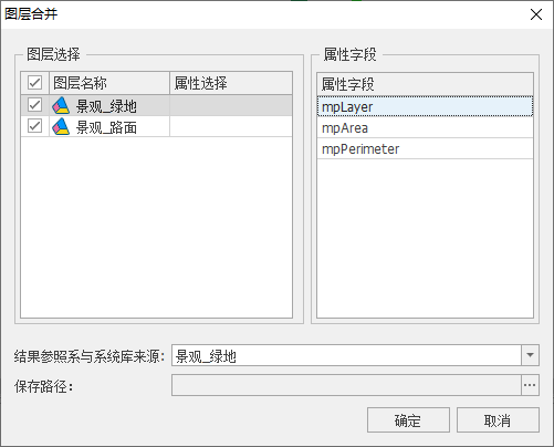 2. 在“图层合并”对话框中,设置属性字段、结果参照系与系统库来源以及保存路径。该页面上,对各个设置项的说明如下:
