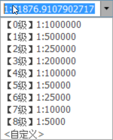3. 点击“当前窗口的比例尺”下拉框,可选择一个比例尺,地图视图会自动缩放到该比例尺下显示。系统默认提供了如下9级显示比例尺。