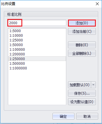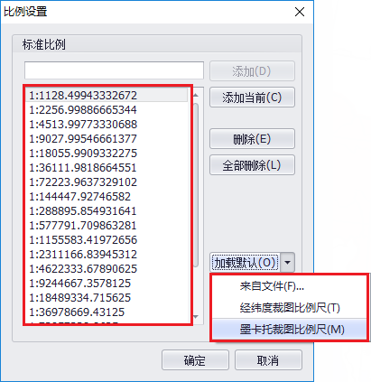 4. 点击【自定义】,可设置默认的比例尺列表。输入比例尺值,点击"添加"按钮,即可新增。也可以加载经纬度或墨卡托的裁图比例尺,或从文件中导入。