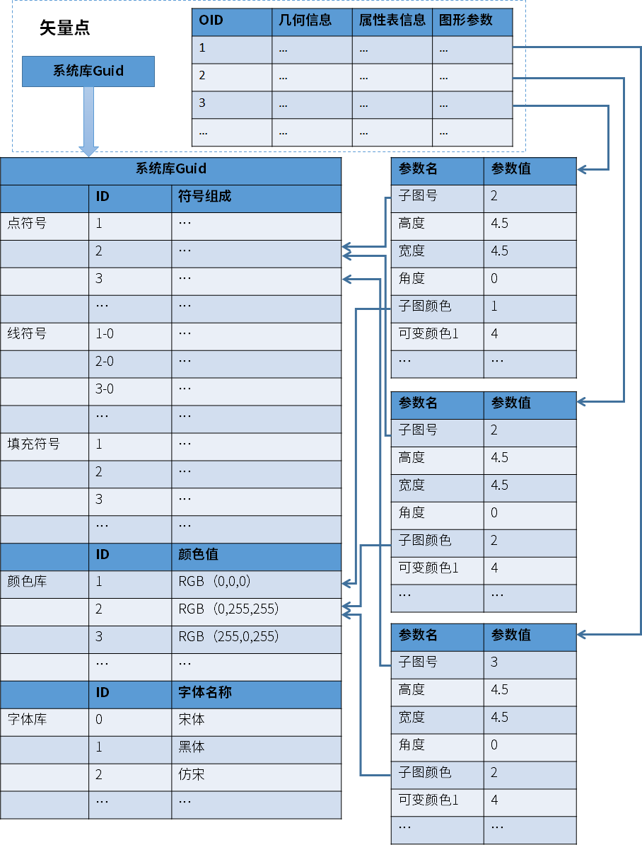 以矢量点为例,“嵌入式”符号化模式的逻辑表结构如下所示,每个图元的图形参数信息中只记录的子图和颜色的序号,具体样式信息存储在对应Guid的系统库中。