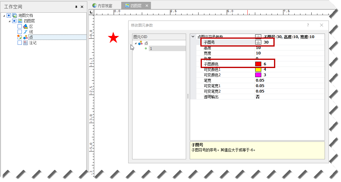 以下图“点”图层为例,其对应的系统库为“MapGIS”,“图形参数”中符号为30,子图颜色为6。即表示点显示时,采用“MapGIS”系统库中的第30个点符号样式,颜色为第6个颜色。查看系统库可发现30号符号为五角星,6号颜色为红色,所以显示为红色五角星。