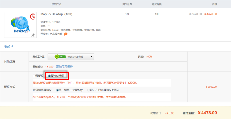 4. 进入“确认订单”页面,可查看订单详细信息,选择“硬Key授权”模式;