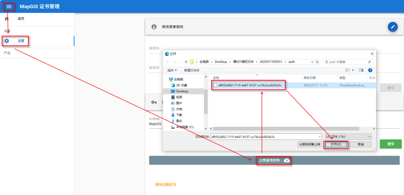 5. 点击MapGIS证书管理左侧按钮,点击设置按钮,进入设置主界面,点击【上传证书文件按钮】,弹出窗口,选择下载的硬Key授权文件,即可加载产品授权信息。