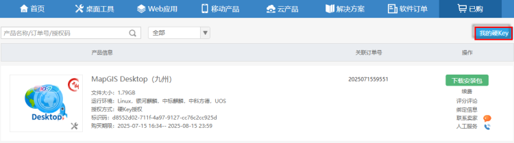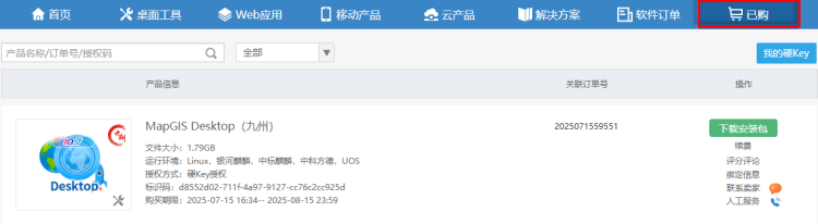 4. 在“云交易中心”-“已购”中选择产品,点击“下载安装包”,可下载“硬Key授权文件”