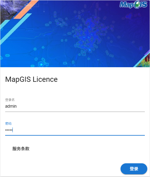 2. 打开浏览器,在地址栏输入http://授权服务器IP:端口即可,如http://127.0.0.1:8080,进入站点,输入“登录名”、“密码”后,点击“登录”,进入“MapGIS证书管理”界面;