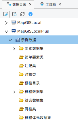 在MapGIS Catalog数据目录中,每个数据库包括要素数据集、简单要素类、注记类、对象类、栅格目录、栅格数据集、镶嵌数据集、网格类、栅格体元数据集 九种类型数据。