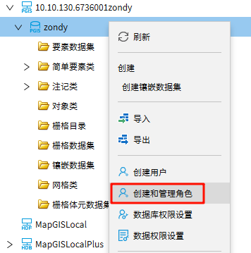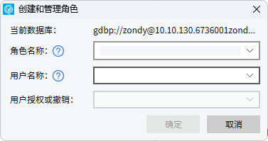 - 在GDBCatalog窗口中数据库右键节点选择创建和管理角色按钮,弹出创建和管理角色界面(需要当前连接用户为超级用户)。