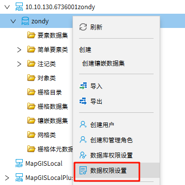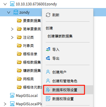 - 在GDBCatalog窗口中数据库右键节点选择数据库权限设置菜单项,弹出数据权限设置界面(需要当前连接用户为超级用户)。