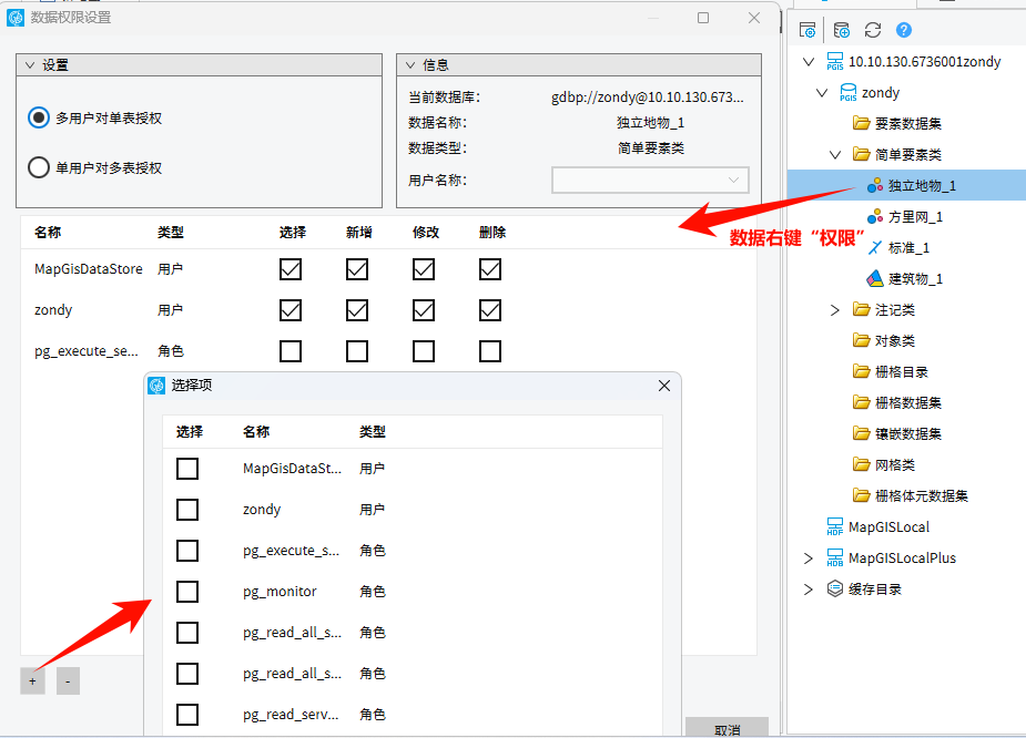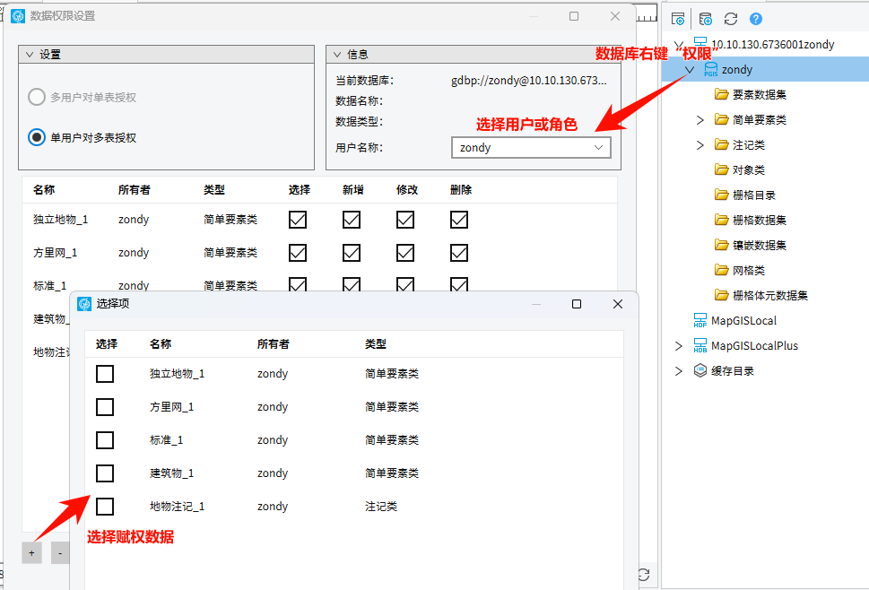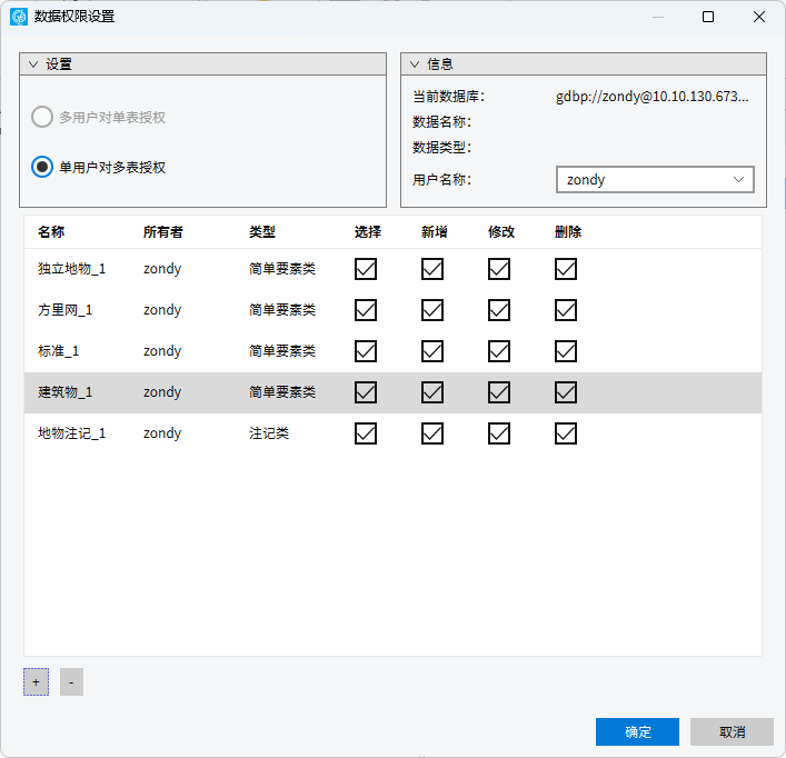 - 当为单用户对多表权限时,即可以设置选择用户同时对其他多个数据的权限,右侧下拉选择需要设置的用户(仅显示创建的用户和角色,不包括数据库默认角色和用户),表格中添加数据并设置选择用户的该数据的权限,包括选择、新增、更新、删除。可通过右键设置全选和全不选。在选择窗口中可通过控件功能过滤和分组。