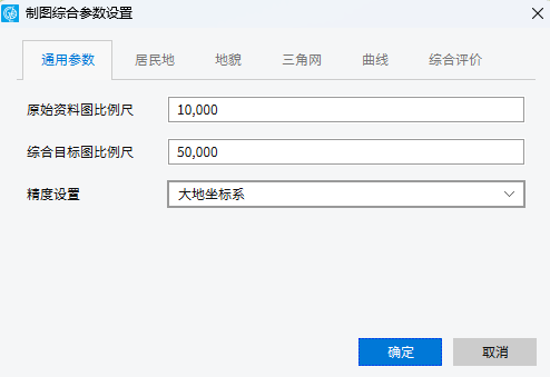 1. 点击菜单【地图】下的【地图综合】-【参数设置】按钮,弹出如下对话框,通过通用参数、居民地、地貌、三角网、曲线、综合评价6个选项来设置综合过程中各种综合参数。